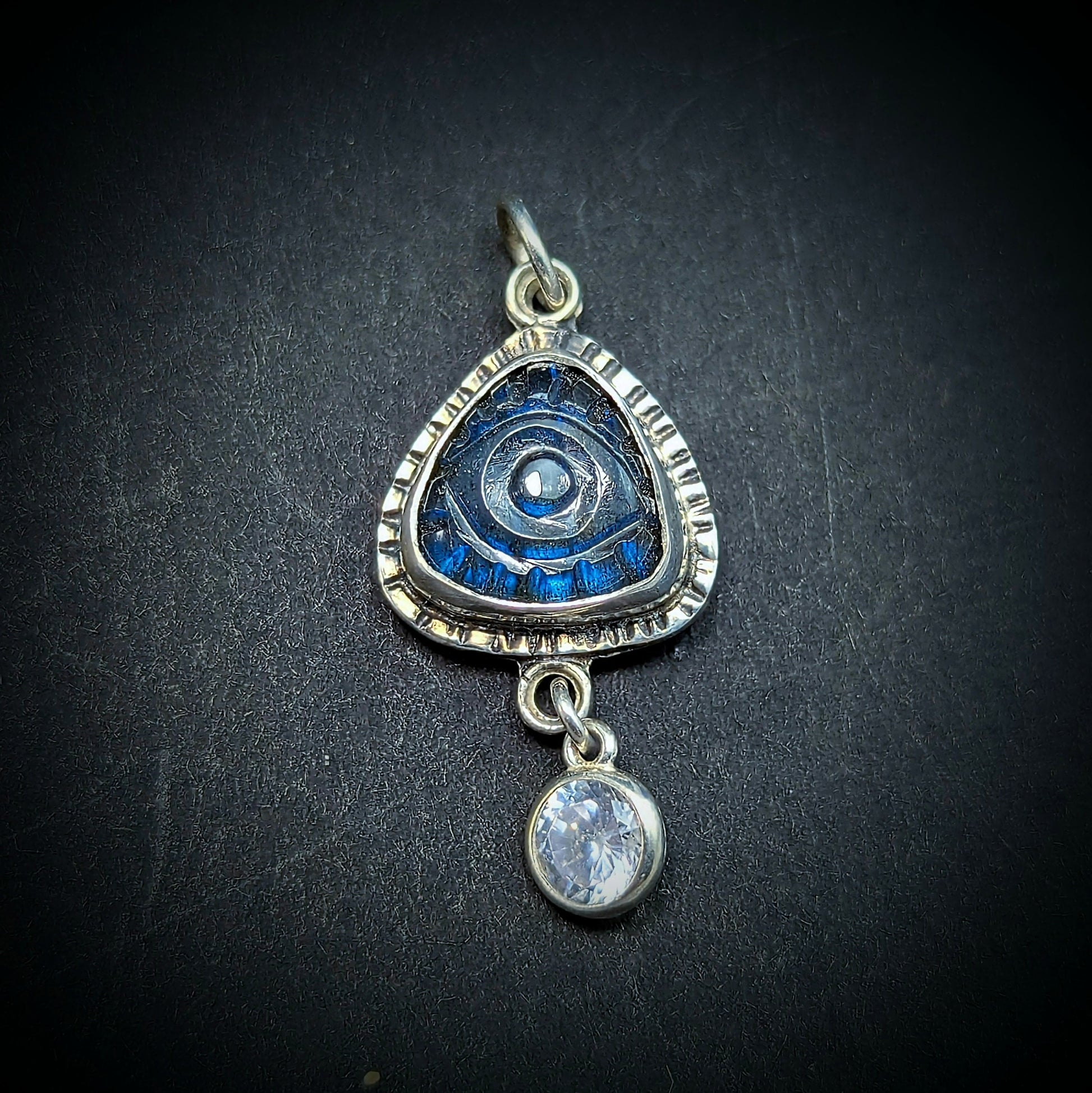 A delicate sterling silver pendant featuring a triangle-shaped, flashy labradorite stone hand-carved with a protective evil eye motif and a sparkly white cubic zirconia. The natural iridescence of labradorite gives off mesmerizing flashes of blue, making each piece one-of-a-kind. Perfectly dainty yet meaningful, this pendant adds a subtle statement to any jewelry collection.