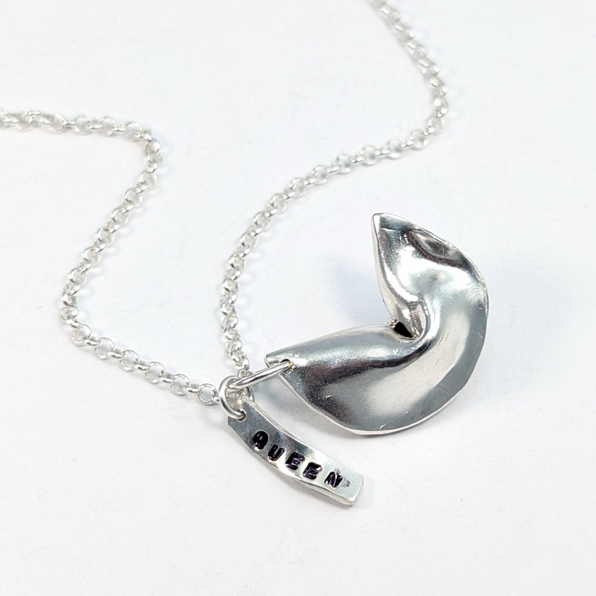 This charming sterling silver fortune cookie pendant is a symbol of luck, hope, and endless possibilities. It features a delicately crafted cookie with a small fortune tag that reads "Queen".