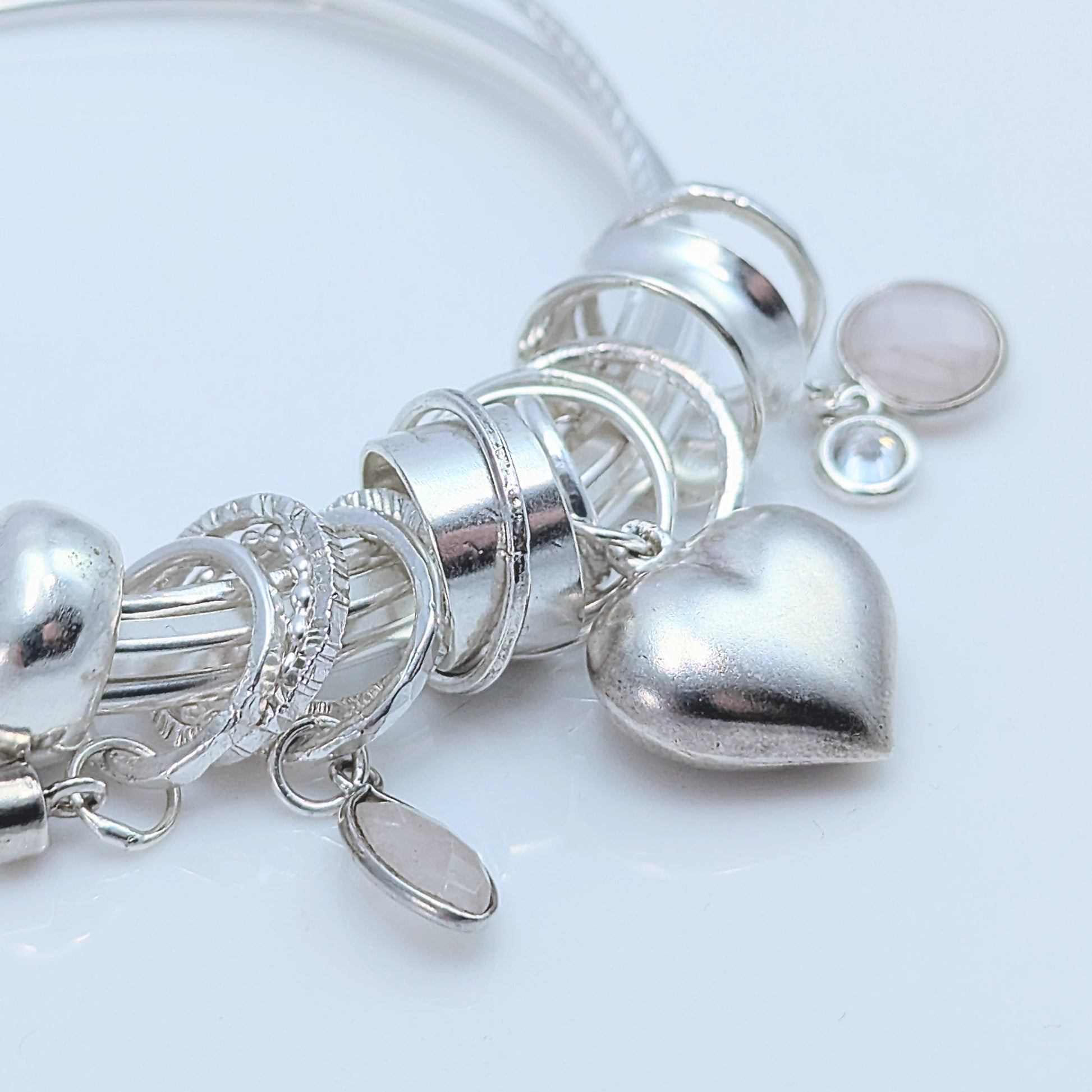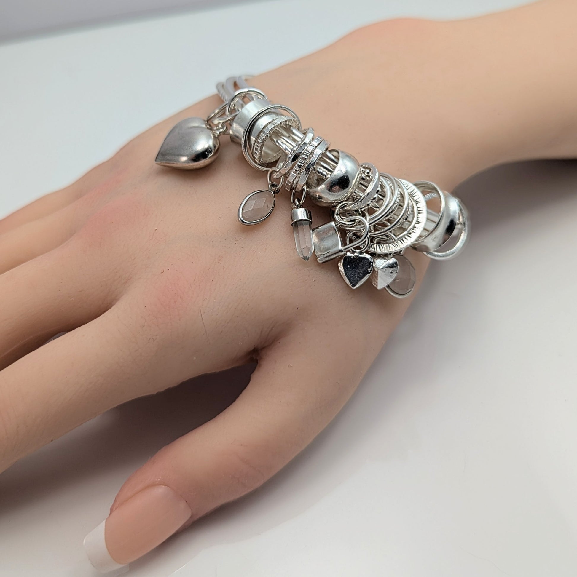 Charms: 22 total, including hearts, padlock, rose quartz, clear quartz, cubic zirconia