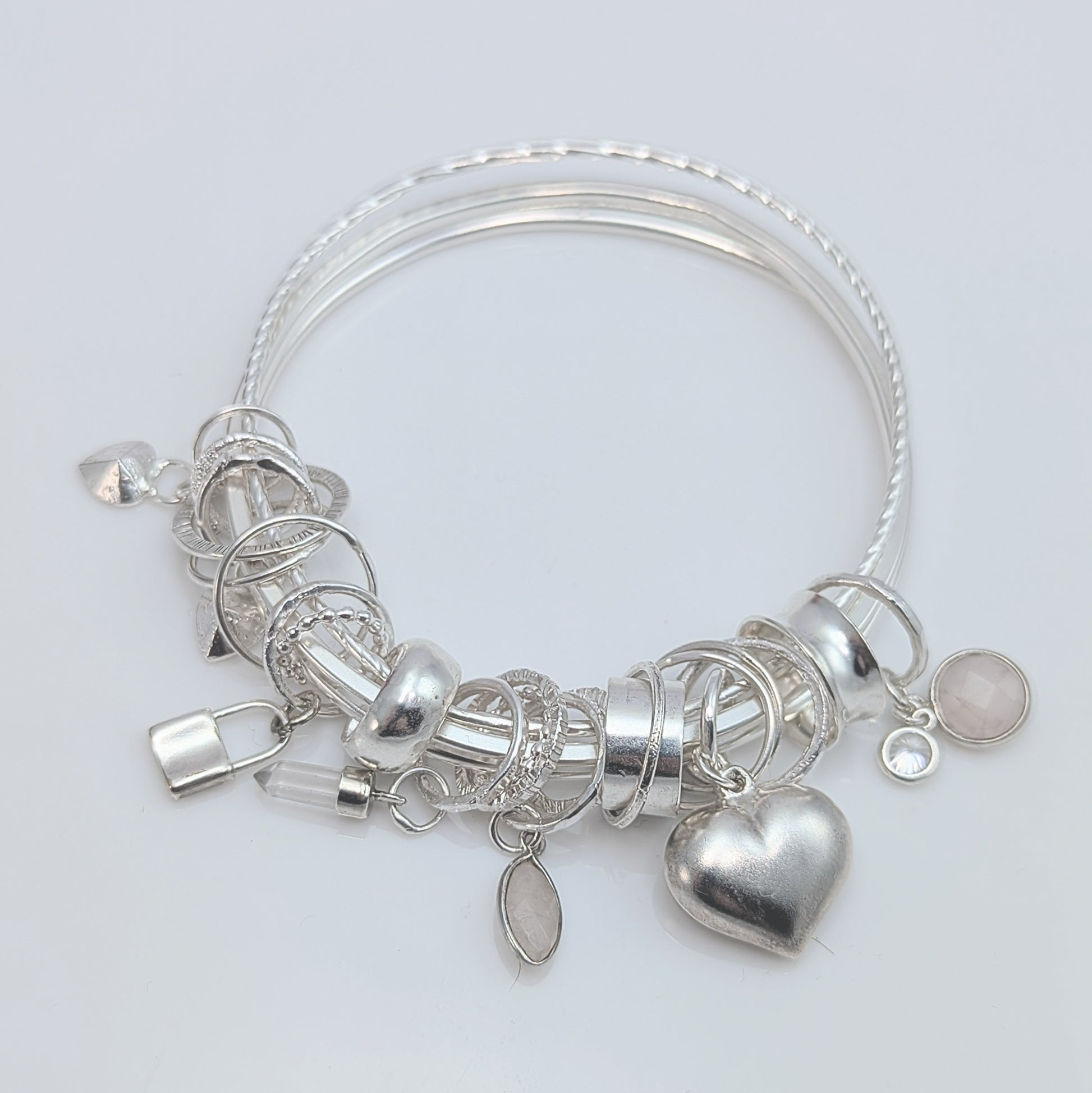 Dainty, musical, and full of meaning — this sterling silver triple bangle cluster features 22 charming details that sway and jingle with every movement. The cluster includes a variety of heart-shaped charms, a delicate padlock, and sparkling accents of rose quartz, clear quartz, and cubic zirconia.